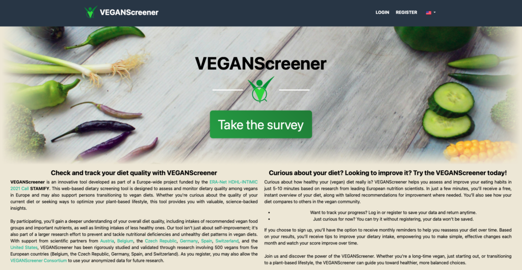 VEGANScreener is a European project to develop a Web- and App-Based Dietary Screening Tool to assess and monitor dietary intake among vegans.